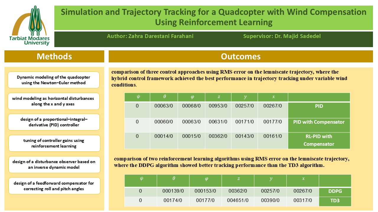 چکیده: امروزه با توجه به افزایش روزافزون بکارگیری کوادروتورها در ماموریتهای مختلف، بهرهگیری از سیستم کنترلی کارآمد و مؤثر ضروری میباشد. کوادروتور در محیطهای بیرونی با اغتشاشات خارجی مختلفی از جمله وزش ناگهانی باد مواجه میشود. در بسیاری از مأموریتها مسیر پروازی کوادکوپتر بهطور دقیق و از پیش تعیینشده مشخص میباشد، به همین دلیل ردیابی صحیح این مسیر اهمیت ویژهای دارد. به دلیل تاثیر مستقیم باد بر پایداری پرواز، پرنده باید با نهایت دقت و بدون انحراف از مسیر مرجع، اهداف تعیین شده را دنبال نماید. هدف این پژوهش، طراحـی کنتـرلکننده هـوشمند برای دستیابـی به ردیابـی مسیرهای مختلف کوادکوپتـر در محیطهایی با بادهای متغیـر میباشد. به این منظور ابتدا به مدلسازی دینامیکی کوادروتور پرداخته شد. مدلسازی باد نیز با اضافه کردن شتاب باد در راستای افقی به معادلات دینامیکی انتقالی پرنده انجام شد. سپس، با هدف کنترل دقیق موقعیت و جهتگیری کوادروتور در حضور اغتشاشات محیطی باد، چارچوبی ترکیبی طراحی شد که شامل یک کنترلکنندهی پایه تناسبی-انتگرالی-مشتقی، یک تنظیمکنندهی ضرایب مبتنی بر یادگیری تقویتی و یک مشاهدهگر اغتشاش بههمراه جبرانساز آن بود. برای تنظیم تطبیقی ضرایب کنترلکننده تناسبی-انتگرالی-مشتقی حین ردیابی مسیر از الگوریتـمهای DDPGوTD3 یادگیری تقویتی بهره برده شد. جهت تخمین شدت باد از یک مدل دینامیک معکوس به عنوان مشاهدهگر استفاده شد. همچنین یک الگوریتم جبرانسازی پیشخور برای اصلاح زوایای مرجع رول و پیچ طراحی شد. جبرانساز با اصلاح زوایای رول و پیچ، انحراف موقعیت را نیز در جهت محورهای x و yجبران میکرد. جهت ارزیابی عملکرد چارچوب کنترلی، آزمایشهای مختلفی در شرایط بدون باد و با شدتهای مختلف باد در مسیرهای مختلف پروازی انجام شد. نتایـج شبیهسازیهای انجام گرفته نشان دادند که در محیطهایی با بادهای متغیـر، اضافه شدن مشاهدهگر اغتشاش و جبرانساز به کنتـرلکننده تناسبـی-انتگرالـی-مشتقـی با ضرایب ثابت 15% خطا را نسبت به حالتی که کنتـرلکننده به تنهایی عمل میکرد کاهش داد. همچنین در آزمایشهای دیگر نتایـج شبیهسازیها نشان دادند که کنتـرلکننده تناسبـی-انتگرالـی-مشتقـی تنظیمشده با الگوریتمهای یادگیری تقویتی همراه با مشاهدهگر و جبرانساز نسبت به حالت ضریب ثابت 25% خطای ردیابی را کاهش داد. در ردیابی مسیرهای مختلف با شدت باد متغیر از الگوریتمهای یادگیری تقویتی نتایج قابل توجهی دریافت شد. در مسیر بینهایت الگوریتم DDPG، %10 بهینهتر از الگوریتم TD3، در مسیر دایروی الگوریتم TD3 %5 بهینهتر از الگوریتم DDPG، و در مسیرهای مارپیچ نیز الگوریتم DDPG، %20 بهینهتر از الگوریتم TD3 عمل کرد.