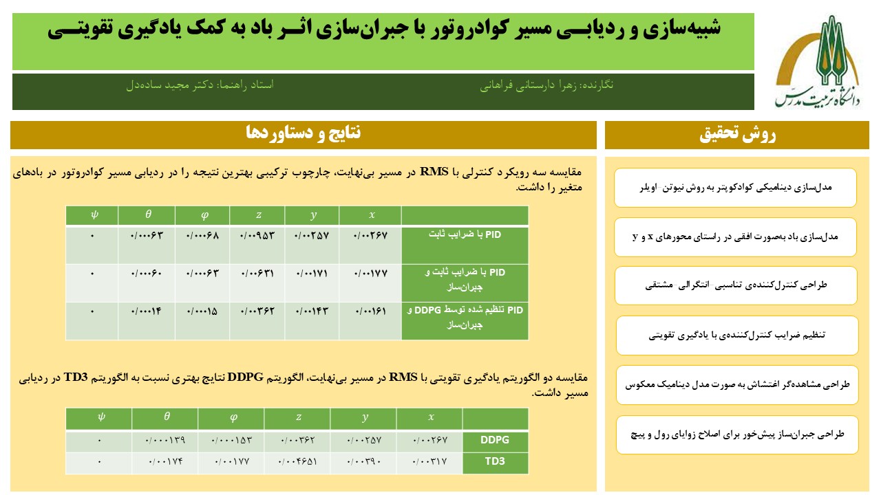 عنوان پایان نامه: شبیهسازی و ردیابی مسیر کوادروتور با جبرانسازی اثر باد به کمک یادگیری تقویتی
