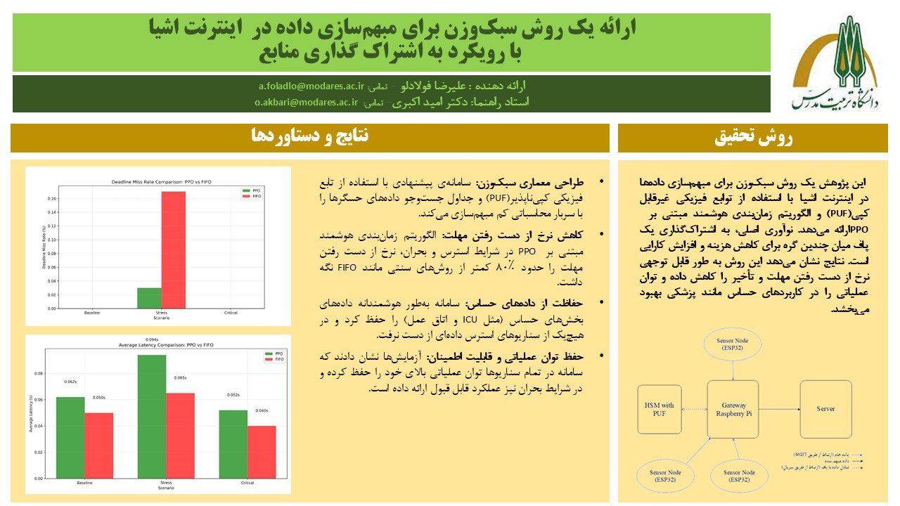 چکیده: این پژوهش با هدف ارائه یک روش سبکوزن برای مبهمسازی دادهها در اینترنت اشیا با رویکرد به اشتراکگذاری منابع انجام شده است. با توجه به محدودیتهای منابع در دستگاههای اینترنت اشیا مانند قدرت پردازش، حافظه و انرژی، روشهای رمزگذاری سنتی برای این دستگاهها غیرعملی هستند. در این تحقیق، از توابع فیزیکی غیرقابل کپی (PUF)برای مبهمسازی دادهها استفاده شده است که از نوسانات فرایند برای تولید شناسه منحصربهفرد بهره میبرد و امنیت بالایی با مصرف انرژی پایین فراهم میکند. نوآوری اصلی این پژوهش، استفاده از یک پاف مشترک برای تمام گرهها به جای تخصیص یک پاف به هر گره است که هزینهها را کاهش میدهد. همچنین، الگوریتم یادگیری تقویتی PPO برای اولویتبندی هوشمند حسگرها و مدیریت بهینه منابع به کار گرفته شده است. نتایج ارزیابی نشان میدهد که روش پیشنهادی به طور قابل توجهی نرخ از دست رفتن مهلت و تأخیر را کاهش داده و توان عملیاتی را در مقایسه با روشهای سنتی بهبود میبخشد. این راهکار امنیت کارآمدی برای کاربردهای حساس مانند اینترنت اشیای پزشکی و خودروهای خودران فراهم میکند.