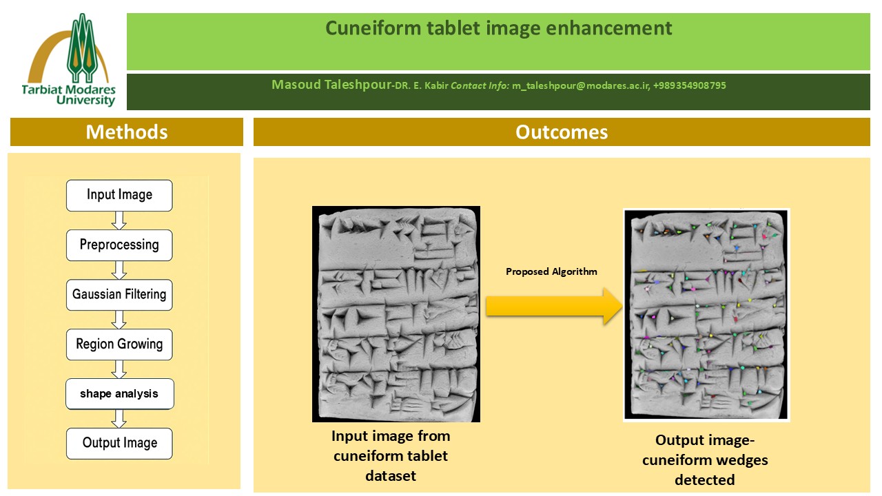 چکیده: آشکارسازی نویسه‌های خط میخی از روی تصاویر دوبعدی کتیبه‌های گلی، همواره با چالش‌های منحصربه‌فردی مواجه بوده است. فرسایش سطوح، شکستگی کتیبه‌ها، شرایط نامناسب نورپردازی در زمان تصویربرداری و وجود بافت پیچیده و ناهموار پس‌زمینه، منجر به تولید تصاویری با نویز بالا می‌گردد. این عوامل، فرآیند یافتن و تشخیص موقعیت نویسه‌ها را مختل کرده و دقت سیستم‌های بازشناسی خودکار را به‌شدت کاهش می‌دهند. بنابراین، طراحی روشی کارآمد برای پیش‌پردازش و آشکارسازی نویسه‌ها در چنین شرایط دشواری، امری حیاتی و اجتناب‌ناپذیر است. رویکرد محوری این تحقیق بر مدل‌سازی تصویر به‌عنوان یک توپوگرافی سه‌بعدی استوار است؛ در این مدل، نویسه‌ها به‌مثابه «دره‌ها» و پس‌زمینه به‌عنوان «ارتفاعات» در نظر گرفته می‌شوند. با الهام از روش حوضه آبریز، عمیق‌ترین نقاط این دره‌ها که معرف مراکز اصلی نویسه‌ها هستند، با دقت بالایی استخراج می‌شوند. سپس  دره‌ها به‌صورت مجازی از آب پر شده و در انتها با استخراج آب به میزان معین، حوضچه‌هایی نیمه‌شکل‌گرفته آشکار می‌گردند که شامل تمام نویسه‌های میخی، خطوط و شکستگی‌ها هستند. در مرحله بعد ، یک فیلتر هندسی ، مبتنی بر تحلیل نسبت ابعاد، توپُری و تعداد رئوس، اشکال غیرمرتبط با مورفولوژی نویسه‌های میخی را حذف می‌کند. در نهایت، با استفاده از یک الگوریتم رشد ناحیه که با خصوصیات خط میخی کنترل می‌شود، مرزهای کامل نویسه‌های آشکارشده بازیابی می‌شوند تا موقعیت و شکل آن‌ها به وضوح مشخص گردد. این رویکرد یکپارچه، راهکاری مؤثر برای آشکارسازی دقیق نویسه‌های خط میخی در شرایط واقعی و چالش‌برانگیز فراهم آورده و زیربنای لازم برای تحلیل‌های آتی در حوزه بازشناسی نویسه‌ها، خواندن کتیبه‌های خط میخی و کمک به متخصصان زبان‌شناسی و باستان‌شناسی دیجیتال را فراهم می‌کند.