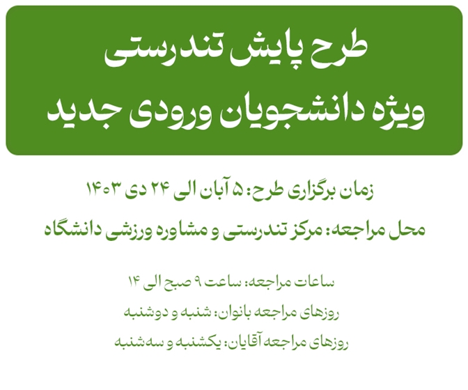 بنا بر اعلام مدیریت ورزشی دانشگاه طرح پایش تندرستی ویژه دانشجویان ورودی جدید از ۵ آبان آغاز و تا ۲۴ دی ماه ۱۴۰۳ ادامه خواهد داشت.
