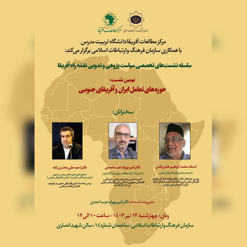 مرکز مطالعات آفریقای دانشگاه تربیت مدرس با همکاری سازمان فرهنگ و ارتباطات اسلامی نهمین نشست از سلسله نشست‌های تخصصی « سیاست پژوهی و تدوین نقشه راه آفریقا» با عنوان «حوزه‌های تعامل ایران و آفریقای جنوبی» را روز   چهارشنبه   13  تیر ۱۴۰۳ در سالن شهید انصاری سازمان فرهنگ و ارتباطات اسلامی برگزار می‌کند. سخنرانان این نشست دکتر امیر بهرام عرب احمدی دانشیار دانشکده مطالعات جهان دانشگاه تهران با موضوع: آسیب شناسی مناسبات سیاسی- فرهنگی و اقتصادی جمهوری اسلامی ایران و آفریقای جنوبی طی ۴۵ سال گذشته، استاد محمد ابراهیم هندریکس نماینده مسلمان پارلمان آفریقای جنوبی با موضوع: بررسی حوزه‌های تعامل، تقابل و رقابت فرهنگی ایران و آفریقای جنوبی در زمینه گفتمان‌ها و رویکردهای جدید دوران گذار و نظم نوین جهانی، دکتر احمد علی محسن زاده مشاور معاون امور مجلس رئیس جمهور (رایزن فرهنگی سابق ج. ا. ایران در آفریقای جنوبی) با موضوع: بررسی مناسبات ایران و آفریقای جنوبی در چارچوب گفتمان انقلاب اسلامی، مدیریت این نشست بر عهده دکتر امیر بهرام عرب احمدی می‌باشد.