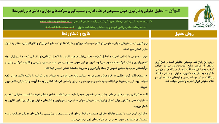 عنوان پایان نامه: تحلیل حقوقی بهره گیری از هوش مصنوعی در نظام اداره و تصمیم گیری شرکت های تجاری (چالش ها و راهبردها)