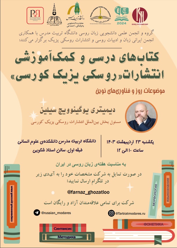 این نشست به مناسبت هفته زبان روسی در ایران به میزبانی دانشگاه تربیت مدرس و با همکاری انتشارات روسکی یزیک کورسی روسیه ۲۳ اردیبهشت سال جاری در سالن استاد شکویی دانشکده علوم انسانی برگزار شد. در این نشست، دیمیتری یوگینوویچ سیلین مسئول بخش بین‌ الملل انتشارات روسکی یزیک کورسی، به معرفی جدیدترین کتاب‌ های درسی و کمک‌ آموزشی انتشارات روسکی‌ یزیک کورسی در حوزه‌ های آموزش زبان عمومی و تخصصی روسی، ادبیات، فرهنگ و تاریخ روسیه پرداخت. در ادامه نشست دانشجویان حاضر در جلسه سوالاتی در زمینه راه‌ های دستیابی به کتاب‌ های این انتشارات را  مطرح و خواستار ایجاد امکانات مناسبی برای تهیه کتاب‌ها جهت رفع نیازهای درسی خود شدند. مسئول بخش بین‌ الملل انتشارات مذکور در پایان ضمن ابراز علاقمندی به همکاری با اساتید و دانشجویان ایرانی چندین کتاب منتشرشده در انتشارات روسکی یزیک کورسی را به گروه زبان روسی دانشگاه تربیت مدرس اهدا کرد. گفتنی است انتشارات روسکی یزیک کورسی ناشر تخصصی کتاب‌ های آموزش زبان روسی در کشور روسیه است.