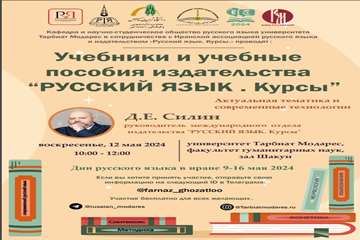 این نشست به مناسبت هفته زبان روسی در ایران به میزبانی دانشگاه تربیت مدرس و با همکاری انتشارات روسکی یزیک کورسی روسیه ۲۳ اردیبهشت سال جاری در سالن استاد شکویی دانشکده علوم انسانی برگزار شد. در این نشست، دیمیتری یوگینوویچ سیلین مسئول بخش بین‌ الملل انتشارات روسکی یزیک کورسی، به معرفی جدیدترین کتاب‌ های درسی و کمک‌ آموزشی انتشارات روسکی‌ یزیک کورسی در حوزه‌ های آموزش زبان عمومی و تخصصی روسی، ادبیات، فرهنگ و تاریخ روسیه پرداخت. در ادامه نشست دانشجویان حاضر در جلسه سوالاتی در زمینه راه‌ های دستیابی به کتاب‌ های این انتشارات را  مطرح و خواستار ایجاد امکانات مناسبی برای تهیه کتاب‌ها جهت رفع نیازهای درسی خود شدند. مسئول بخش بین‌ الملل انتشارات مذکور در پایان ضمن ابراز علاقمندی به همکاری با اساتید و دانشجویان ایرانی چندین کتاب منتشرشده در انتشارات روسکی یزیک کورسی را به گروه زبان روسی دانشگاه تربیت مدرس اهدا کرد. گفتنی است انتشارات روسکی یزیک کورسی ناشر تخصصی کتاب‌ های آموزش زبان روسی در کشور روسیه است.