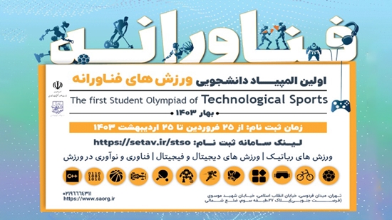 المپیاد ورزش های فناورانه دانشجویی از سوی سازمان امور دانشجویان به منظور بروز خلاقیت دانشجویان و همچنین گسترش استفاده از فناوری های روز دنیا در حوزه های ورزشی، با حضور کلیه دانشجویان از تمام رشته ها و دانشگاه های سراسر کشور در ۳ حوزه ورزش های رباتیک، ورزش های دیجیتال و فیجیتال، فناوری و نوآوری برگزار می شود. دانشجویان می توانند تا ۲۵ اردیبهشت ماه با مراجعه به آدرس Setav. ir/stso نسبت به ثبت نام خود اقدام کنند.