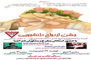 مراسم جشن بزرگ ازدواج دانشجویی با حضور دکتر شاهین فرهنگ و حجت‌الاسلام موسوی واعظ، دوشنبه ۲۹ اردیبهشت ۱۴۰۴ از ساعت ۹ صبح در سالن جابربن حیان آغاز می شود.