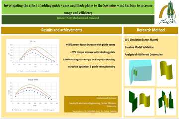 چکیده: پیشینه پژوهش در زمینه بهبود بازده توربین بادی ساونیوس مملو از مطالعاتی است که بر بهینه‌سازی هندسه پره‌ها متمرکز بوده‌اند. از جمله این مطالعات، کار مرجع محمد و همکاران (2019) است که از یک صفحه مسدودکننده برای سد کردن جریان باد ورودی به پره بازگشتی استفاده نمود و بهبود قابل توجهی در عملکرد پایه توربین گزارش کرد. با این حال، بررسی تأثیر همزمان صفحات مسدودکننده و پره‌های راهنما و نیز مقایسه کمی این دو روش، کمتر مورد توجه قرار گرفته است.در این پژوهش، با الهام از مطالعه پایه مذکور، تأثیر افزودن همزمان صفحات مسدودکننده (Deflectors) و پره‌های راهنما (Guide Vanes) بر روی توربین ساونیوس با استفاده از شبیه‌سازی دینامیک سیالات محاسباتی (CFD) مورد بررسی قرار گرفت. مدل پایه شبیه‌سازی با موفقیت با داده‌های تجربی مطالعه مرجع اعتبارسنجی گردید. سپس، چهار هندسه مختلف شامل مدل پایه، مدل مجهز به صفحه مسدودکننده، مدل مجهز به دو پره راهنما و مدل مجهز به پنج پره راهنما تحلیل و مقایسه شدند.دستاوردهای اصلی و مزایای کار حاضر عبارتند از: