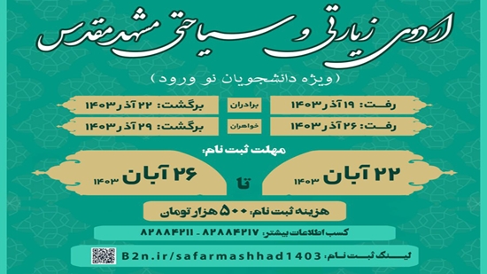 سفر زیارتی و سیاحتی مشهد مقدس با اولویت دانشجویان نو ورود ۱۴۰۳