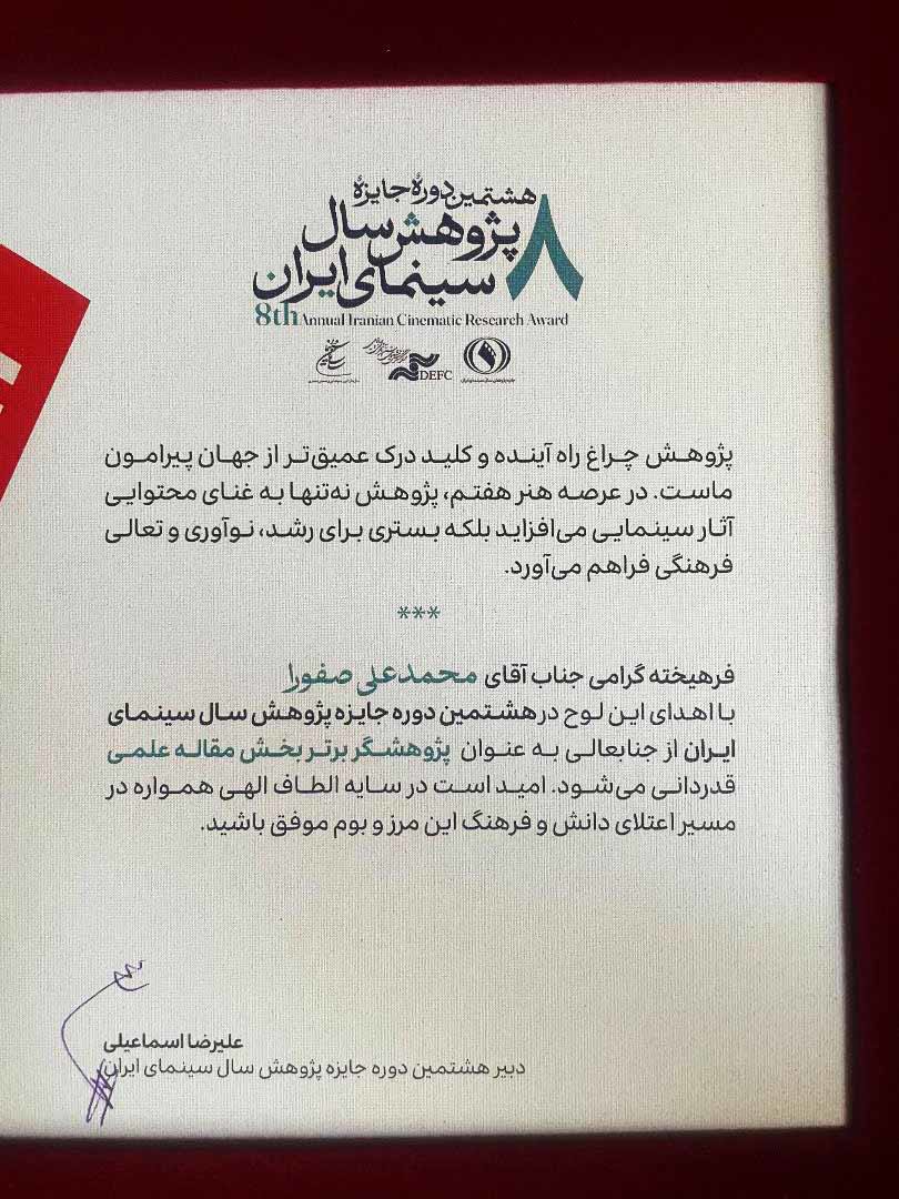 عنوان مقاله علمی برتر «هشتمین جایزه پژوهش سال سینمای ایران» به دکتر محمدعلی صفورا، عضو هیات علمی دانشگاه تربیت مدرس اهدا شد.