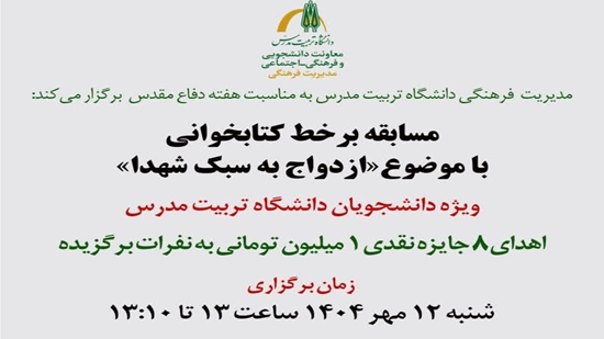به گزارش مدیریت فرهنگی دانشگاه تربیت مدرس؛ مسابقه برخط کتابخوانی ازدواج به سبک شهدا با محوریت کتاب دامادی خوبان؛ در تاریخ دوازدهم مهر ماه 1404 برگزار گردید. دراین مسابقه دانشجویانی که به تمامی سوالات مسابقه پاسخ صحیح داده بودند؛ برنده مسابقه شناخته شدند. اسامی برندگان عبارتند از: فاطمه فرد امیر کنده، زهرا کاظمی، سینا نصرت آبادی، فاطمه نصرتی، زهرا نظام آبادی، شیرین ویسی، فرناز اسدی، زهرا ایمانی، علی خلیلی، گلناز ذوالفقاری.