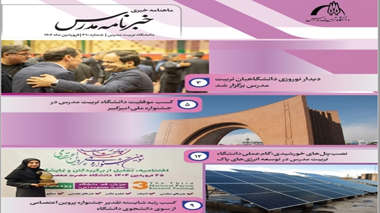 در این شماره می خوانید: دیدار نوروزی دانشگاهیان تربیت مدرس برگزار شد/ کسب موفقیت دانشگاه تربیت مدرس در جشنواره ملی امیرکبیر / نصب پنل‌های خورشیدی؛ گام عملی دانشگاه تربیت مدرس در توسعه انرژی‌های پاک/ کسب رتبه شایسته تقدیر جشنواره پروین اعتصامی از سوی دانشجوی دانشگاه