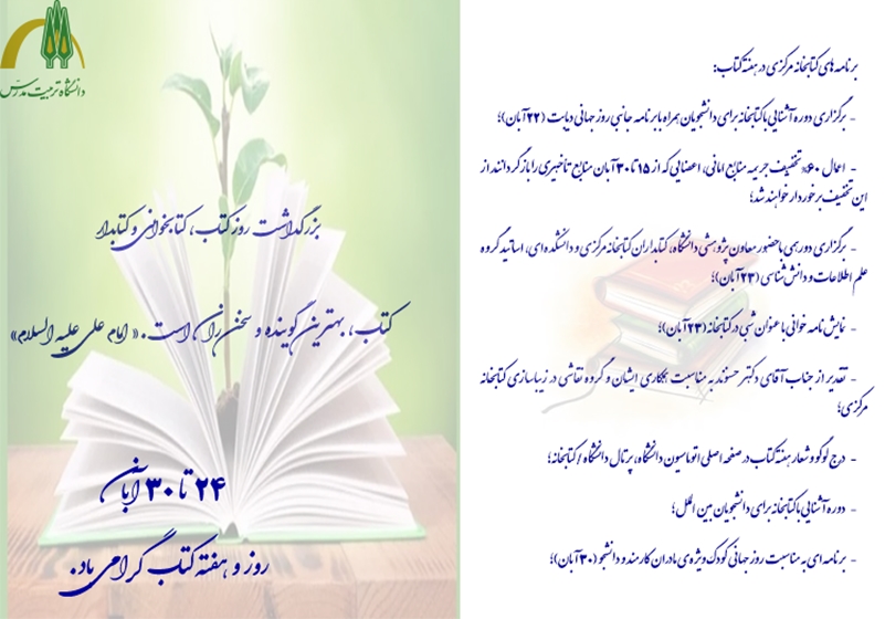 برگزاری دوره آشنایی با کتابخانه مرکزی برای دانشجویان همراه با برنامه جانبی روز جهانی دیابت (۲۲ آبان)؛ برگزاری دورهمی کتابداران با حضور همکاران کتابخانه مرکزی و دانشکده ‌ ای، معاونت پژوهشی و فناوری، اساتید گروه علم اطلاعات و دانش ‌ شناسی؛ نمایشنامه خوانی با عنوان « شبی در کتابخانه» با مشارکت تعدادی از دانشجویان ورودی جدید؛ برنامه ‌ ای به مناسبت روز جهانی کودک (۳۰ آبان): چگونه برای کودک خود کتاب مناسب انتخاب کنیم؟ (بر اساس اصول شورای کتاب کودک و فهرست معتبر ادبیات کودک) و کار- بازی منتخب با استفاده از سواد تربیتی برای آموزش ارزشهای اخلاقی به کودکان بالای ۵ سال (برگرفته از یک تجربه بین المللی همراه با آموزش حضوری) از جمله برنامه‌ های مدیریت منابع علمی و کتابخانه به مناسبت هفته کتاب می‌باشد.