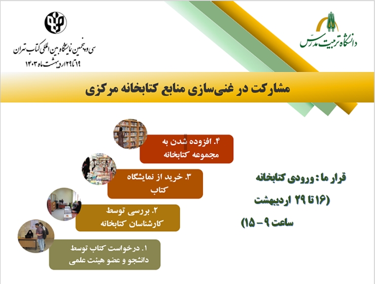 با توجه به برگزاری نمایشگاه بین‌ المللی کتاب از تاریخ ۱۹ تا ۲۹ اردیبهشت ماه، مدیریت منابع علمی و کتابخانه، جهت سرعت و سهولت کار و با هدف توسعه منابع روزآمد و غنی ‌ سازی مجموعه کتابخانه، ایستگاه ثبت سفارش مجازی را از ۱۶ تا ۲۹ اردیبهشت ساعت ۹ تا ۱۵، در محوطه مقابل کتابخانه برپا می‌‌ نماید. کارشناسان کتابخانه، سفارش مراجعان را دریافت و برای خرید اقدام خواهند کرد. دانشگاهیان محترم که امکان مراجعه حضوری به ایستگاه ثبت سفارش را ندارند، می‌‌ توانند درخواست خود را در سامانه ثنا ثبت نمایند.   راهنمای ثبت سفارش در سامانه ثنا