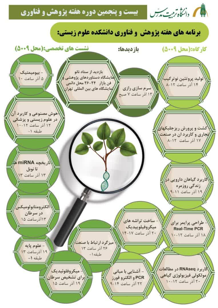 با هدف گرامیداشت هفته پژوهش، دانشکده علوم زیستی برنامه‌ها و فعالیت‌های مختلف پژوهشی شامل؛ نشست‌های تخصصی، کارگاه و بازدید‌های علمی به شرح زیر برگزار می‌کند. نشست‌های تخصصی (۵۰۰۹) - بیومیمتیک (نانو زیست الهام) ۵ اذر   ساعت ۱۰ (مدرس دکتر مریم نیکخواه عضو هیات علمی گروه نانوبیوتکنولوژی) - هوش مصنوعی و کاربرد ان در علوم زیستی و پزشکی ۱۲ اذر ۱۲-۱۰ طبقه ۱- (مدرس دکتر نیلی احمد ابادی) - تاریخچه miRNA ها، تا نوبل ۱۳ اذر ساعت ۱۳ (مدرس دکتر بهرام محمدسلطانی عضو هیات علمی گروه ژنتیک) - الکترومتابولومیکس در سرطان ۱۳ اذر- نقش بنیادی علوم پایه در پیشبرد سایر علوم ۱۹ اذرساعت ۱۵/۳۰-۱۴ سالن جابربن حیان (مدرس دکتر سلیمانی) - میکروفلوئیدیک   برای تشخیص سرطان ۱۹ اذر ساعت  ۱۵- میزگرد ارتباط با صنعت   27 اذر ساعت ۹   سالن جابر بن حیان (با شرکت دکتر ساجدی و دکتر حسن نیا اعضای هیات علمی گروه بیوشیمی) کارگاه (محل ۵۰۰۹) - تولید پروتیین نو ترکیب ۱۴ اذر ساعت ۱۲-۸ (مدرس دکتر فرنگیس عطایی مدیر گروه بیوشیمی) - کشت و پرورش ریزجلبک‌های تجاری و کاربرد ان در صنعت ۱۷ اذر ساعت   ۱۲-۸ (مدرس دکتر فاطمه زرین کمر معاون پژوهشی دانشکده علوم زیستی) - کاربرد گیاهان دارویی در زندگی روزمره ۱۹ اذر ۱۱-۹ (مدرس دکتر فاطمه زرین کمر معاون پژوهشی دانشکده علوم زیستی) - طراحی پرایمر برای Real-Time PCR  یکشنبه ۱۸ آذر ساعت ۱۲-۱۰ (مدرس دکتر باباشاه عضو هیات علمی گروه ژنتیک) - کاربرد RNAseq در مطالعات مولکولی فیزیولوژی گیاهی ۲۰ اذر ۱۲-۱۰   (مدرس دکتر شریفی هیات علمی گروه علوم گیاهی) - اشنایی با مبانی PCR و الکترو فورز ۲۲اذر ساعت۱۴-۹ (مدرس دکتر صادقی زاده مدیر گروه ژنتیک) - ساخت تراشه‌های میکروفیلوییدیک ۲۰ اذر ساعت ۱۷-۱۴   - مروری بر فن اوری‌های پیشرفته ساخت زخم پوش‌های هوشمند   ۲۵ اذر ۱۷-۱۵ (مدرس دکتر میرزاپور مدیر کل اموزش) بازدیدهابازدید از نمایشگاه نانو ۶ اذربازدید از سرم سازی رازی   ۱۳ اذر ساعت ۷ صبحبازدید از ستاد ویژه توسعه نانو ۱۳ اذر ۱۲-۱۰نمایشگاه دستاوردهای پژوهشی و فن بازار ۲۶-۲۴ محل دایمی نمایشگاه‌های بین المللی تهران