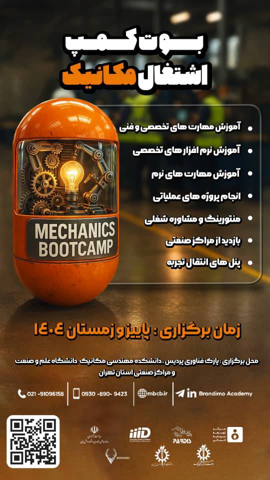 بوت‌کمپ تخصصی اشتغال در حوزه مکانیک (پلی برای ورود از دانشگاه به صنعت) ویژه‌ی دانشجویان و فارغ‌التحصیلان رشته‌های مرتبط با مهندسی مکانیک توسط مرکز توسعه سرمایه انسانی پارک فناوری پردیس و با حمایت معاونت علمی فناوری و اقتصاد دانش بنیان ریاست جمهوری و دانشکده مهندسی مکانیک دانشگاه علم و صنعت ایران، با هدف ارتقاء مهارت‌های تخصصی و عملی شرکت‌کنندگان و تسهیل ورود آنان به بازار کار حرفه‌ای در حوزه مهندسی مکانیک طراحی شده است. محورهای اصلی دوره شامل: آموزش مهارت‌های تخصصی و فنی مرتبط با مکانیک، تقویت مهارت‌های نرم و بین‌فردی، منتورینگ و مشاوره مسیر شغلی، آموزش نرم‌افزارهای تخصصی در صنعت مکانیک، بازدید از مراکز و واحدهای صنعتی و انجام پروژه‌های عملی است و زمان برگزاری بوت‌کمپ پاییز و زمستان ۱۴۰۴ می باشد. این دوره در  پارک فناوری پردیس، دانشکده مهندسی مکانیک دانشگاه علم و صنعت و مراکز صنعتی استان تهران برگزار می شود.علاقمندان می توانند جهت دریافت اطلاعات بیشتر با شماره های ۰۹۰۵۵۵۲۳۱۸۹ و ۰۹۳۸۷۳۸۷۹۱۳ و پشتیبانی تلگرام: ( @mbcb_ir ) تماس بگیرند.  لینک ثبت‌نام