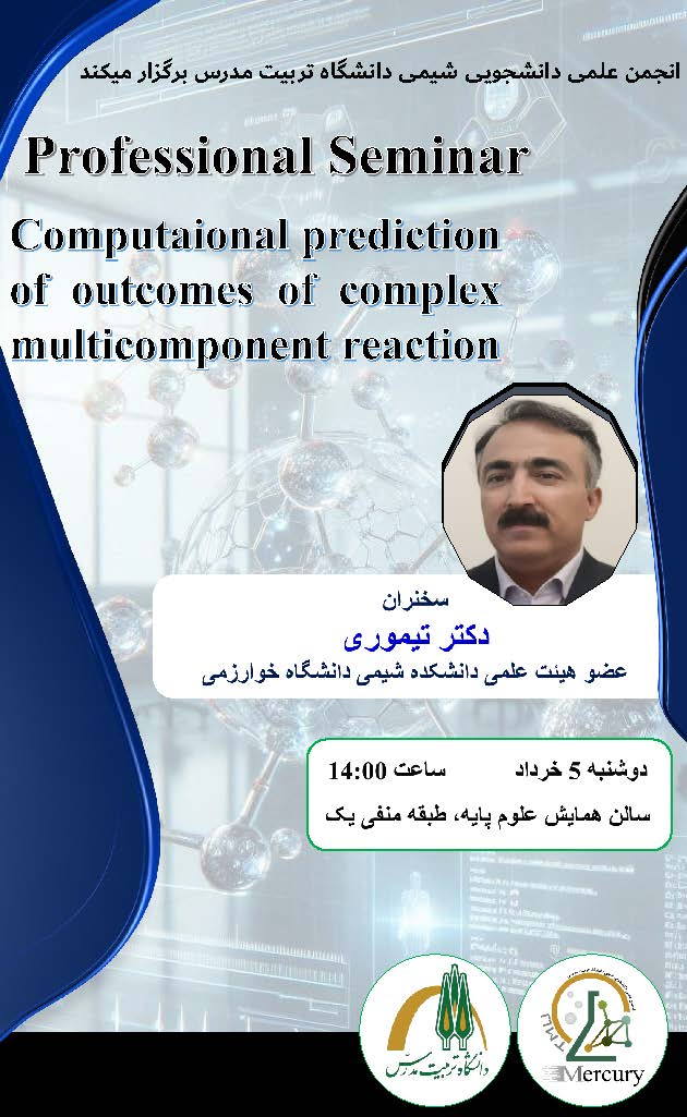 سخنرانی تخصصی دکتر محمدباقر تیموری، استاد برجسته شیمی آلی از دانشگاه خوارزمی، با عنوان Computational prediction of outcomes of complex multicomponent reaction، روز دوشنبه ۵ خرداد ۱۴۰۴ از ساعت ۱۴ الی ۱۶ در سالن آمفی‌تئاتر دانشکده علوم دانشگاه تربیت مدرس برگزار خواهد شد.دکتر تیموری از پژوهشگران فعال در حوزه مدل‌سازی و شبیه‌سازی واکنش‌های چندجزئی پیچیده به شمار می‌رود و اخیراً مقاله‌ای در مجله معتبر Journal of Chemical Sciences (JCS) منتشر کرده است که مورد توجه جامعه علمی قرار گرفته است.این سخنرانی به بررسی روش‌های محاسباتی در پیش‌بینی مسیرهای واکنشی، ارزیابی پایداری ترکیبات واسطه، و بهینه‌سازی فرآیند سنتز می‌پردازد. هدف این برنامه فراهم آوردن بستری علمی برای تبادل نظر میان پژوهشگران و دانشجویان علاقه‌مند به شیمی محاسباتی و واکنش‌های چندجزئی است.