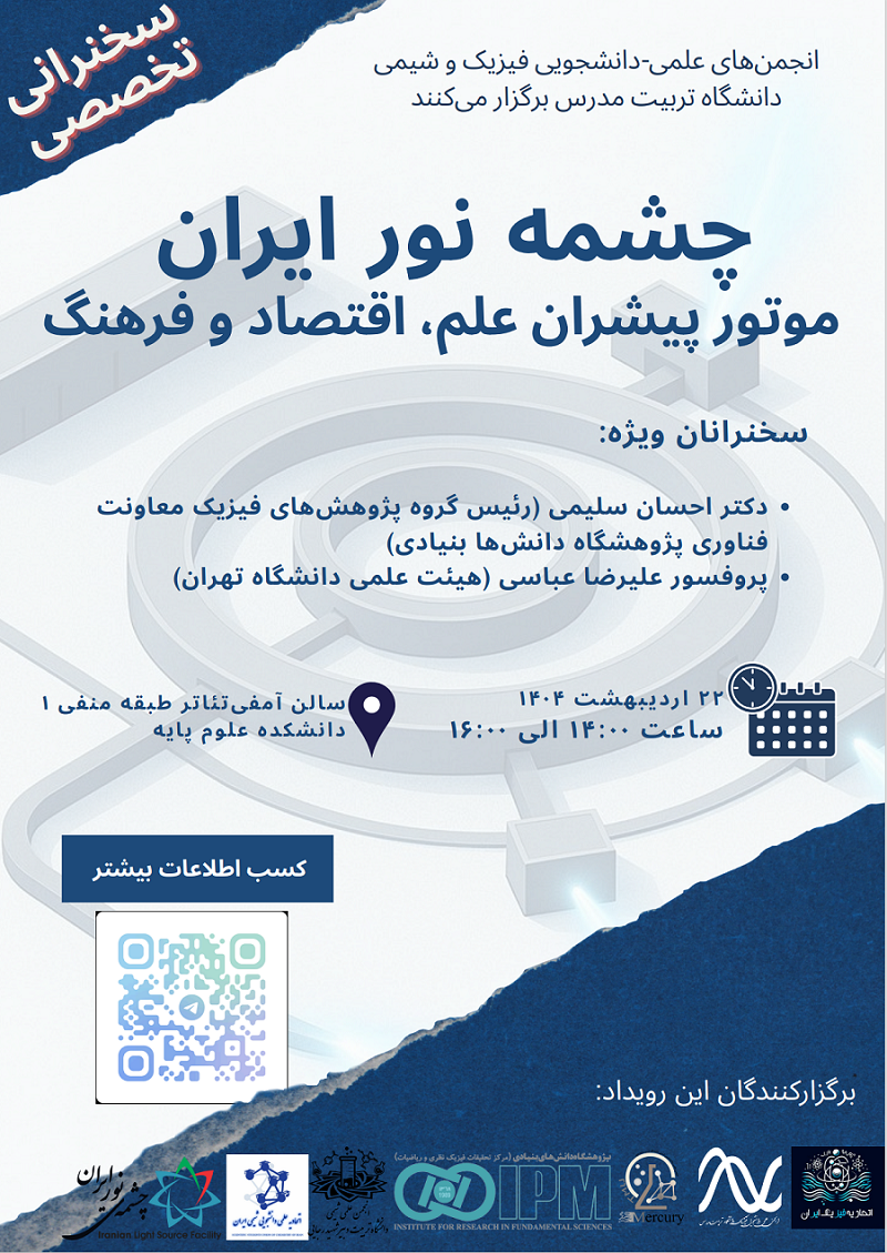 انجمنهای علمی-دانشجویی فیزیک و شیمی دانشگاه تربیت مدرس با همکاری مجموعهای از مراکز علمی و پژوهشی برجسته کشور، سخنرانی تخصصی با عنوان «چشمه نور ایران؛ موتور پیشران علم، اقتصاد و فرهنگ» را برگزار میکنند. در این نشست علمی که روز دوشنبه ۲۲ اردیبهشت ۱۴۰۴ از ساعت ۱۴:۰۰ تا ۱۶:۰۰ در سالن آمفیتئاتر دانشکده علوم پایه واقع در طبقه منفی یک برگزار میشود، به معرفی ظرفیتها و اهمیت راهبردی چشمه نور ایران (Iranian Light Source Facility) پرداخته خواهد شد. چشمه نور ایران به عنوان یک زیرساخت ملی، نقش کلیدی در توسعه تحقیقات بنیادی و کاربردی در حوزههای گوناگون همچون علوم پایه، پزشکی، علم مواد، انرژی، کشاورزی و حتی علوم انسانی و اجتماعی دارد.سخنرانان این رویداد دکتر احسان سلیمی، رئیس گروه پژوهشهای فیزیک در معاونت فناوری پژوهشگاه دانشهای بنیادی و دکتر علیرضا عباسی، عضو هیئت علمی دانشگاه تهران خواهند بود. این برنامه فرصتی ارزشمند برای دانشجویان، پژوهشگران و علاقهمندان به علوم بینرشتهای است تا از نزدیک با کاربردهای متنوع و اثرگذار این پروژه علمی-فناورانه آشنا شوند. در پایان نشست، برنامه حمایت از کاربران ایرانی در آزمایشگاههای سنکروترون جهان نیز معرفی خواهد شد؛ برنامهای که با پشتیبانی معاونت علمی، فناوری و اقتصاد دانشبنیان ریاست جمهوری در حال اجراست.