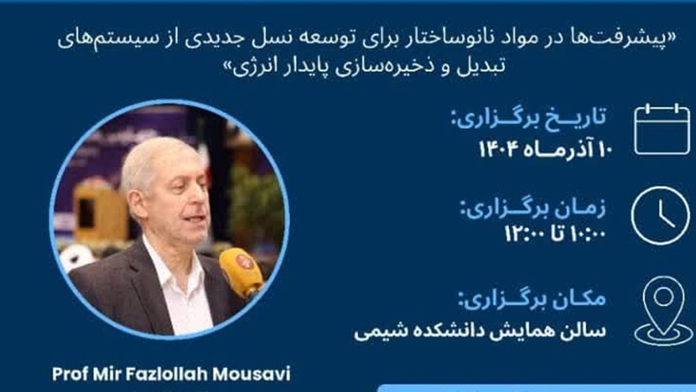 جلسه سخنرانی علمی در حوزه سیستم های تبدیل و ذخیره سازی پایدار انرژی با حضور دکتر میرفضل اله موسوی عضو هیأت علمی دانشگاه تربیت مدرس 10 آذر 1404 در دانشگاه خوارزمی برگزار می شود.