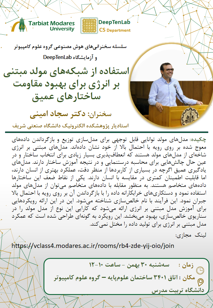 جلسه سخنرانی علمی گروه علوم کامپیوتر و آزمایشگاه DeepTenLab با عنوان «استفاده از شبکه های مولد مبتنی بر انرژی برای بهبود مقاومت ساختارهای عمیق» 30 بهمن برگزار می شود.