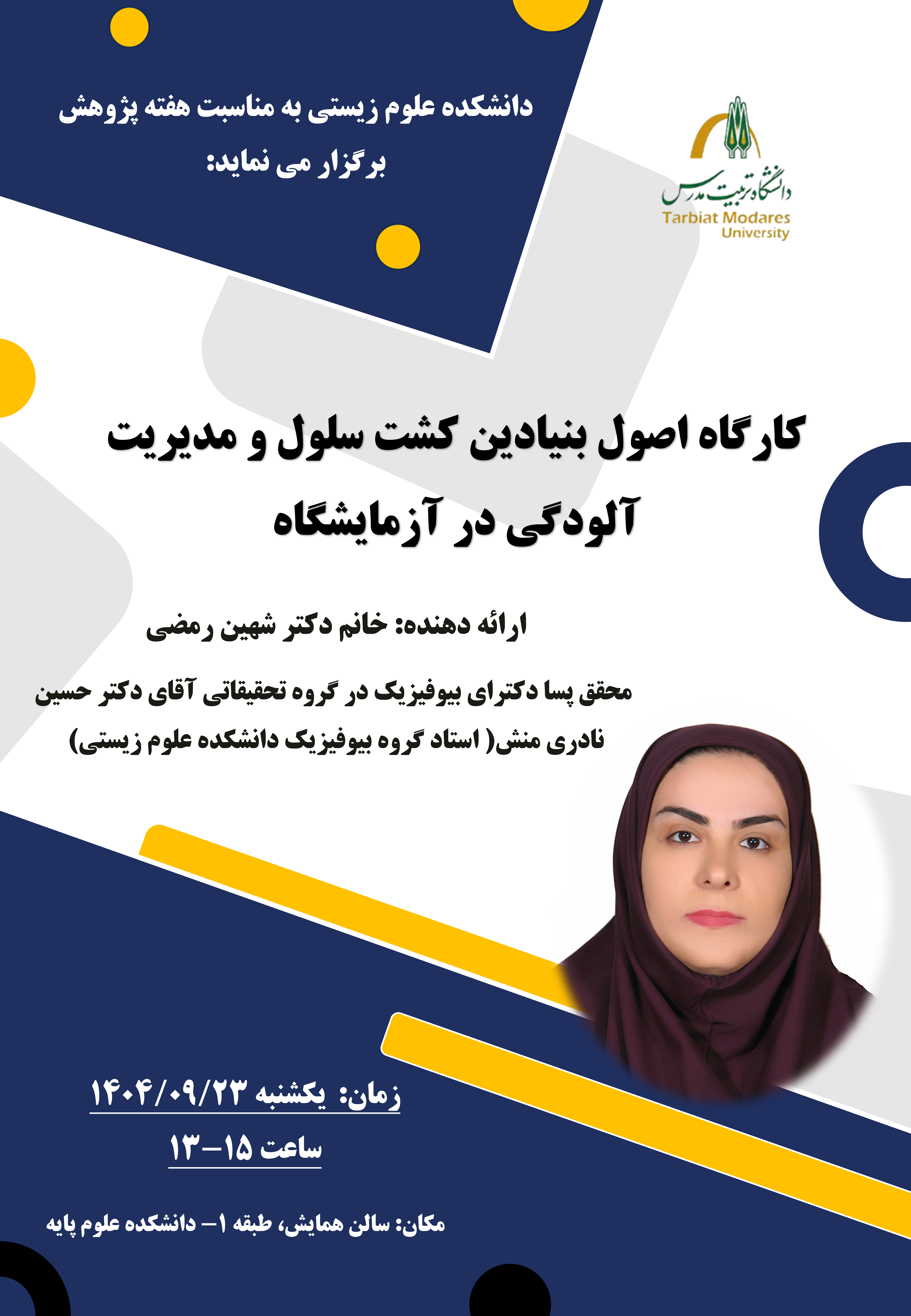 به مناسبت هفته پژوهش کارگاه آموزشی با عنوان اصول بنیادین کشت سلول و مدیریت آلودگی در آزمایشگاه را با سخنرانی دکتر شهین رمضی محقق پسا دکترای بیوفیزیک در گروه تحقیقاتی دکتر حسین نادری منش (استاد گروه بیوفیزیک دانشکده علوم زیستی) روز یکشنبه  23 آذر ماه سال جاری از ساعت 13 تا 15 در سالن همایش علوم پایه برگزار می شود.