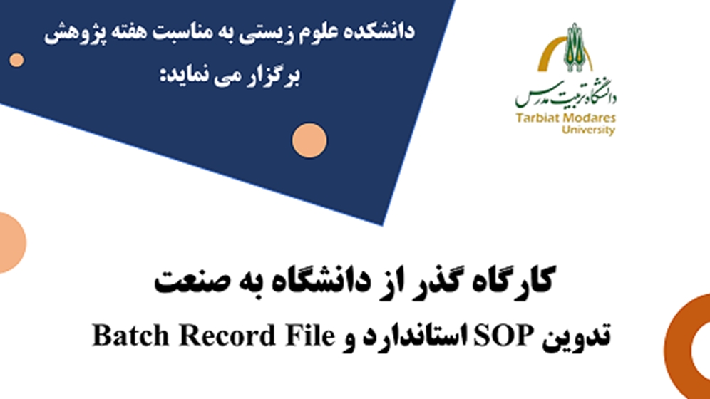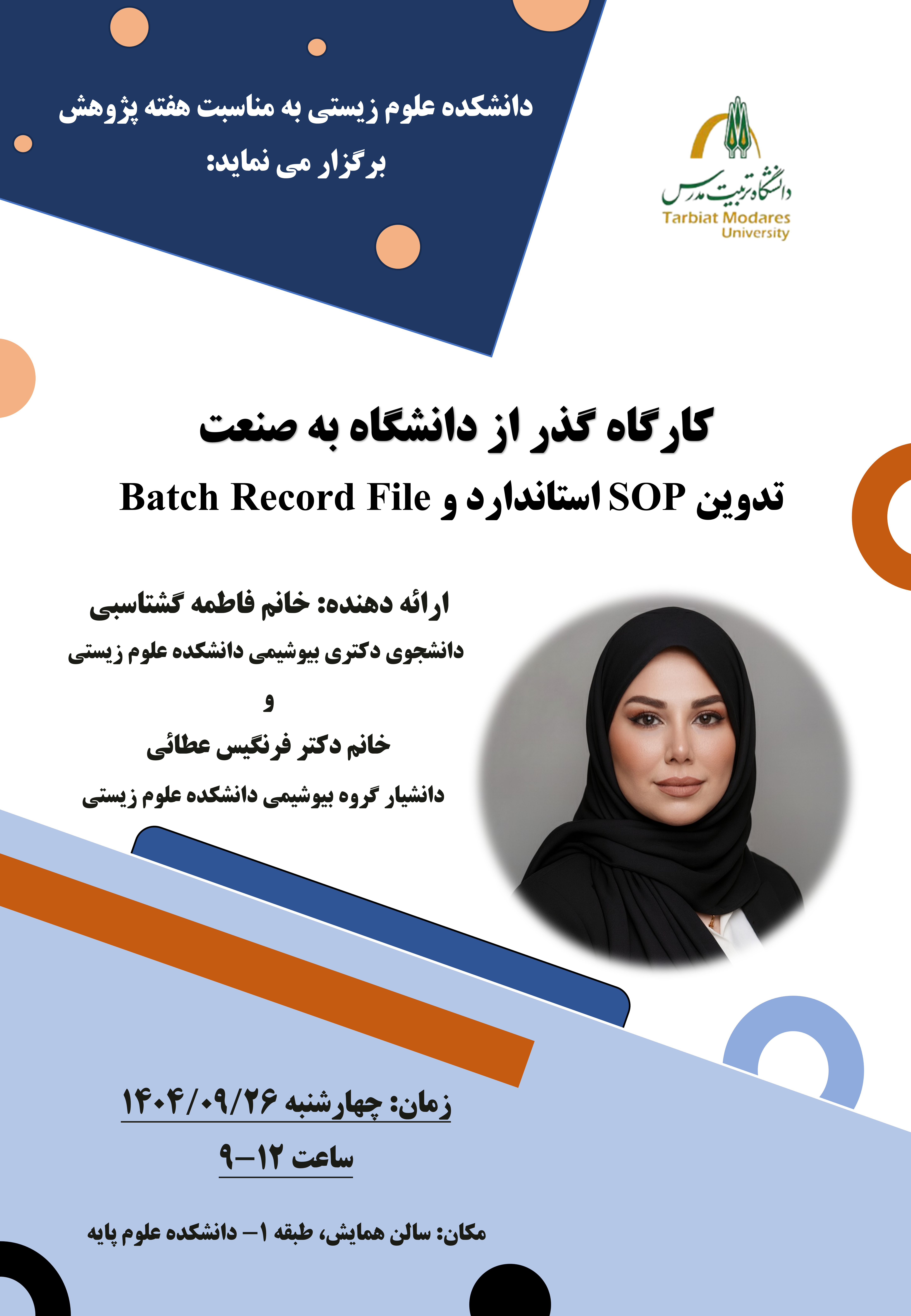 به مناسبت هفته پژوهش کارگاه آموزشی با عنوان گذر از دانشگاه به صنعت تدوین sop  استاندارد و Batch Record File با سخنرانی فاطمه گشتاسبی دانشجوی دکتری بیوشیمی دانشکده علوم زیستی و دکتر فرنگیس عطائی دانشیار گروه بیوشیمی دانشکده علوم زیستی روز چهارشنبه 26 آذر ماه سال جاری از ساعت 9 تا 12 در سالن همایش علوم پایه برگزار می شود.