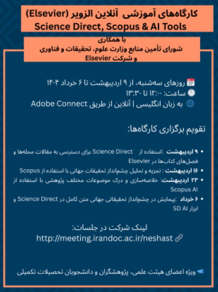 شورای تأمین منابع علمی وزارت عتف در نظر دارد؛ به مدت چهار هفته در روزهای سهشنبه ساعت 12 تا 13:30 به وقت تهران، برای همه دانشگاههای کشور کارگاه آموزشی آشنایی با دو پایگاه مهم شرکت الزویر ScienceDirect AI و Scopus AI را برگزار نماید.