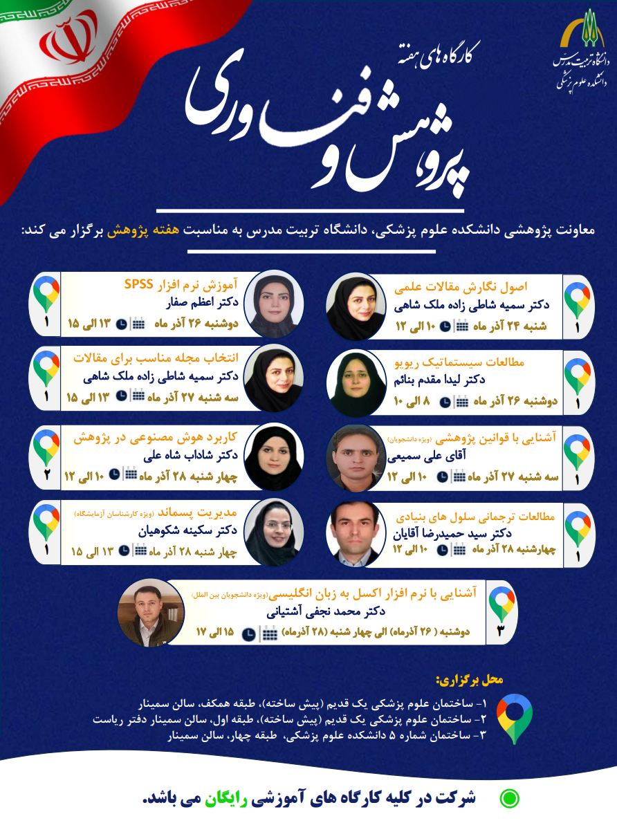 با هدف گرامیداشت هفته پژوهش، دانشکده علوم پزشکی کارگاه های مختلف آموزشی-پژوهشی برگزار می کند.