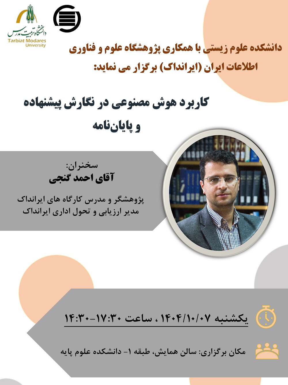 کارگاه مذکور با سخنرانی احمد گنجی پژوهشگر و مدرس کارگاه های ایرانداک و  مدیر ارزیابی و تحول اداری ایرانداک یکشنبه ۷ دی ماه جاری از ساعت ۱۴:۳۰ تا ۱۷:۳۰ در سالن همایش دانشکده علوم پایه برگزار می شود.