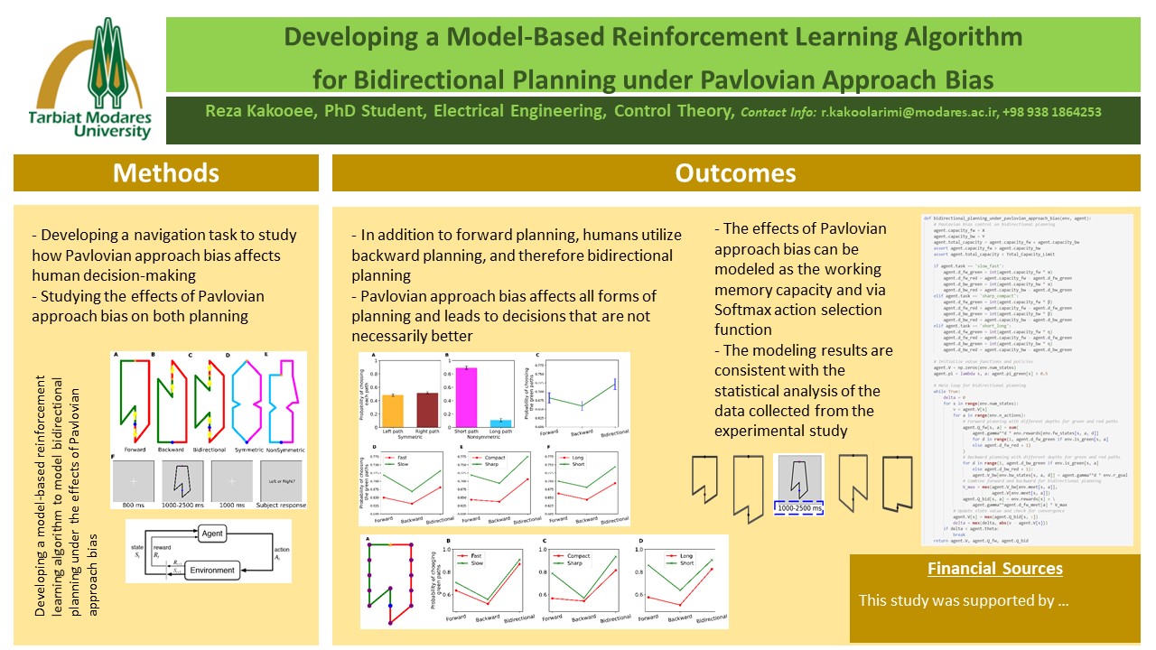 چکیده: شناسایی و مدل سازی سازوکارهای گوناگون مغز که فرآیندهای شناختی مانند تصمیم گیری را هدایت می کنند، دست کم از سه جنبه ی مختلف حائز اهمیت فراوانی می باشد. نخست از دیدگاه علمی، شناسایی فرآیندهای شناختی راهی است به سوی کشف نادانسته هایی در مورد مغز انسان؛ همان ارگان پیچیده ای که دنیای مدرن امروزی را خلق کرده است. دوم از دیدگاه پزشکی، درک سازوکارهای مغزی می تواند بابی به روی پاسخ گویی به چالش های متفاوتی باشد که امروزه پزشکان در مواجهه با بسیاری از بیماری های مغزی با آن روبرو هستند. سوم از دیدگاه مهندسی است که خود از دو منظر می تواند درخور توجه باشد: اول، درک مناسب تر روابط و تعاملات بین اجزای گوناگون مغزی به منظور ارائه نظریه های ابتکاری در جهت تفسیر فرآیندهای مغزی، و دوم یاری رساندن به خود فضای مهندسی است. بدان معنا که مدل های کشف شده شاید الهام بخش ابداع الگوریتم هایی گردند که در حل مسائل مهندسی کاراترند. در این بین شناسایی و مدل سازی سازوکارهای نهفته در پشت فرآیند تصمیم گیری، شایسته ی توجه موشکافه ای است. بدان جهت که تصمیم گیری نقش مهمی در جوانب گوناگون زندگی بازی می کند. پژوهش های موجود نشان می دهند که تصمیمات در مغز در بستر دو سازوکار مجزا و در عین حال مرتبط به هم شکل می گیرند: یادگیری پاولفی و کنترل ابزاری. یادگیری پاولفی با آموختن پیوند محرک-پیامد به یادگیری منجر می شود بدون آن که به عمل انتخابی وابسته باشد. همچنین پاسخ های غریزی ای را بازنمایی می کند که در طول فرگشت در مغز ایجاد شده و به وسیله ی ایماهای محیط هدایت می شوند. به گونه ای که انسان ها گرایش به نزدیک شدن به محرک های نوید دهنده ی پاداش دارند در مقایسه با محرک های خنثی، و محرک هایی که نشان از دریافت تنبیهی دارند. در طرف مقابل کنترل ابزاری نوعی فرآیند یادگیری است که با توجه به عملی که از تصمیم گیرنده سر زده، و بازخوردی که از طرف محیط در پاسخ به آن رفتار دریافت شده، موجب تقویت یا تضعیف احتمال بروز مجدد آن رفتار در آینده می گردد. این کنترلگر به ما می آموزد در هر شرایطی بهترین عمل برای انجام چیست. البته یادگیری ابزاری تنها به نتیجه ی عمل کنونی بسنده نکرده، و ممکن است به صورت یک برنامه ریزی روبه جلو دنباله ای از عمل ها را ارزیابی کند. از طرفی، برنامه ریزی روبه جلو ممکن است تنها فرآیند برنامه ریزی ای نباشد که یادگیری ابزاری از آن استفاده می کند. ممکن است انسان ها از برنامه ریزی روبه وارو نیز به منظور ارزیابی توالی عمل ها بهره برند. با این وجود برنامه ریزی روبه وارو کمتر تاکنون مورد توجه قرار گرفته است. پژوهش های پیشین نشان دادند با وجود مستقل بودن یادگیری پاولفی و ابزاری، آن ها با یکدیگر تعامل می کنند. در حقیقت بایاس پاولفی نزدیک شوندگی روی برنامه ریزی روبه جلو تأثیر گذاشته و منجر به اتخاذ تصمیماتی می شود که ممکن است از نظر کنترلگر ابزاری بهینه نباشند. اما تأثیر یادگیری پاولفی روی برنامه ریزی روبه وارو هنوز مطالعه نشده است. در این رساله، ما یک آزمایش مسیریابی طراحی کردیم که امکان برنامه ریزی های روبه جلو، روبه وارو، و دوسویه در آن فراهم است، و ایماهای پاولفی نزدیک شوندگی را نیز در نقشه ها تعبیه نمودیم. تحلیل آماری داده های جمع آوری شده از آزمایش نه تنها از وجود برنامه ریزی روبه وارو حکایت می کنند، بلکه نشان می دهند که ایمای پاولفی نزدیک شوندگی بر روی سه برنامه ریزی تأثیر می گذارد، هر چند که این تأثیر در برنامه ریزی دوسویه بیش تر از روبه جلو، و در روبه جلو بیش تر از روبه وارو است. به منظور بررسی دقیق تر، تأثیر سه فاکتور دیگر شامل زمان تصمیم گیری، پیچیدگی آزمایش، و شدت نزدیک شوندگی ایمای پاولفی را روی برنامه ریزی ها نیز مورد بررسی قرار دادیم. همچنین در بستر یادگیری تقویتی، الگوریتم برنامه ریزی دوسویه را تحت بایاس پاولفی گسترش دادیم. نتایج شبیه سازی الگوریتم با نتایج برآمده از آزمایش سازگار بوده و بیان می کنند که تأثیر بایاس پاول