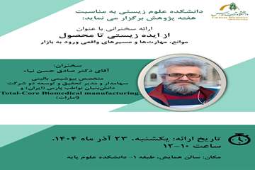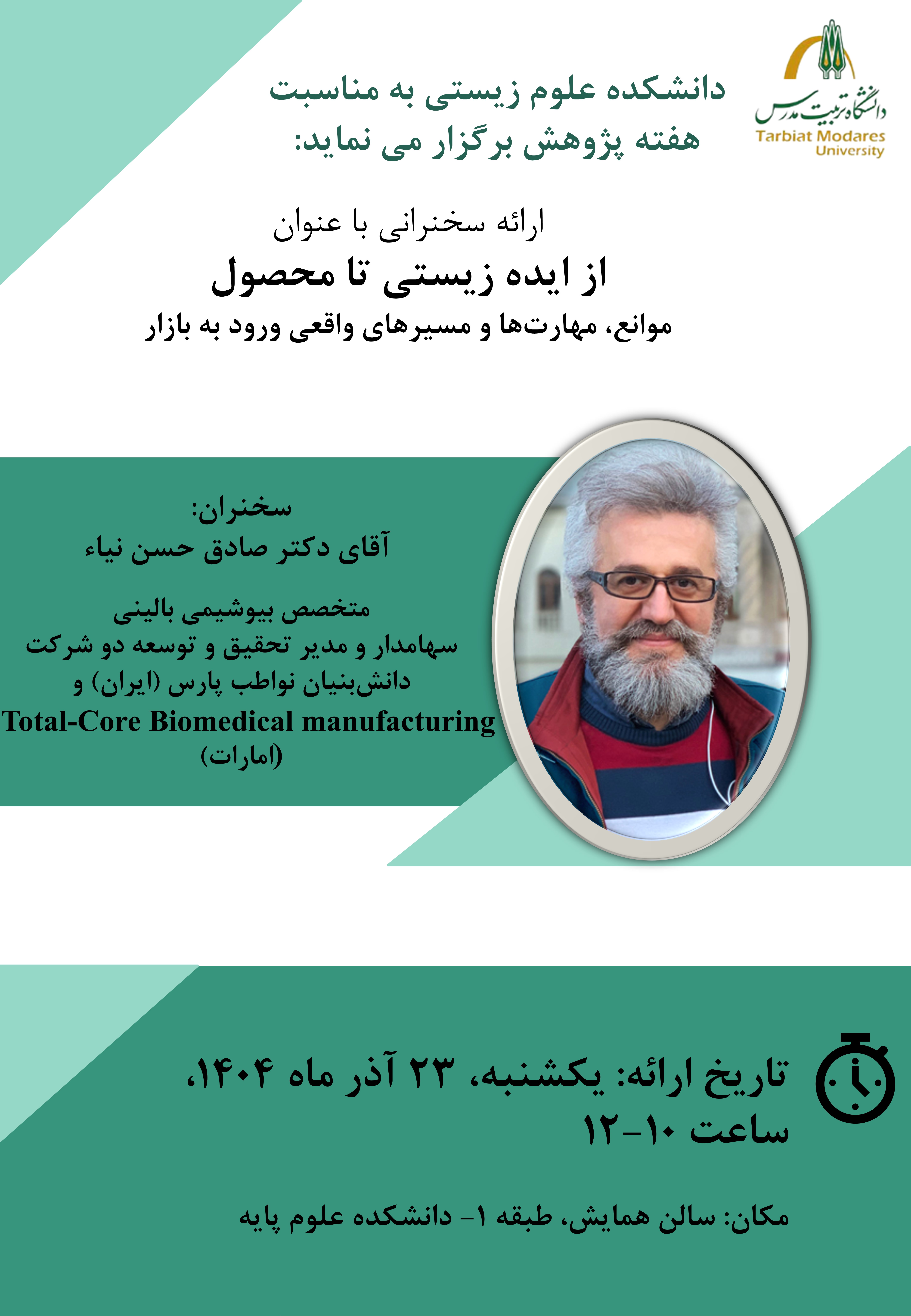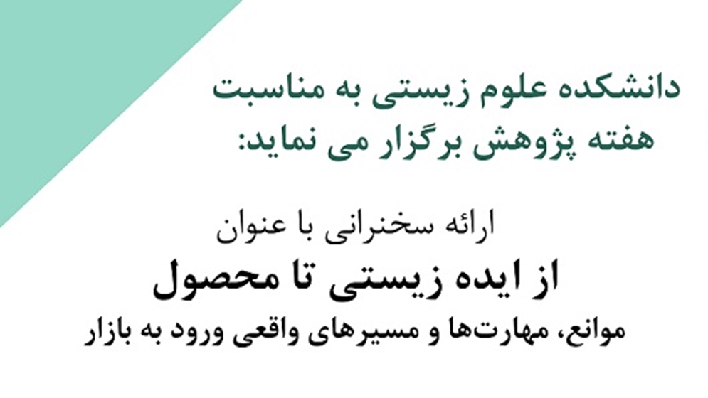 به مناسبت هفته پژوهش جلسه سخنرانی با عنوان از ایده زیستی تا محصول؛ موانع، مهارت ها و مسیرهای واقعی ورود به بازار، ۲۳ آذر برگزار می شود.