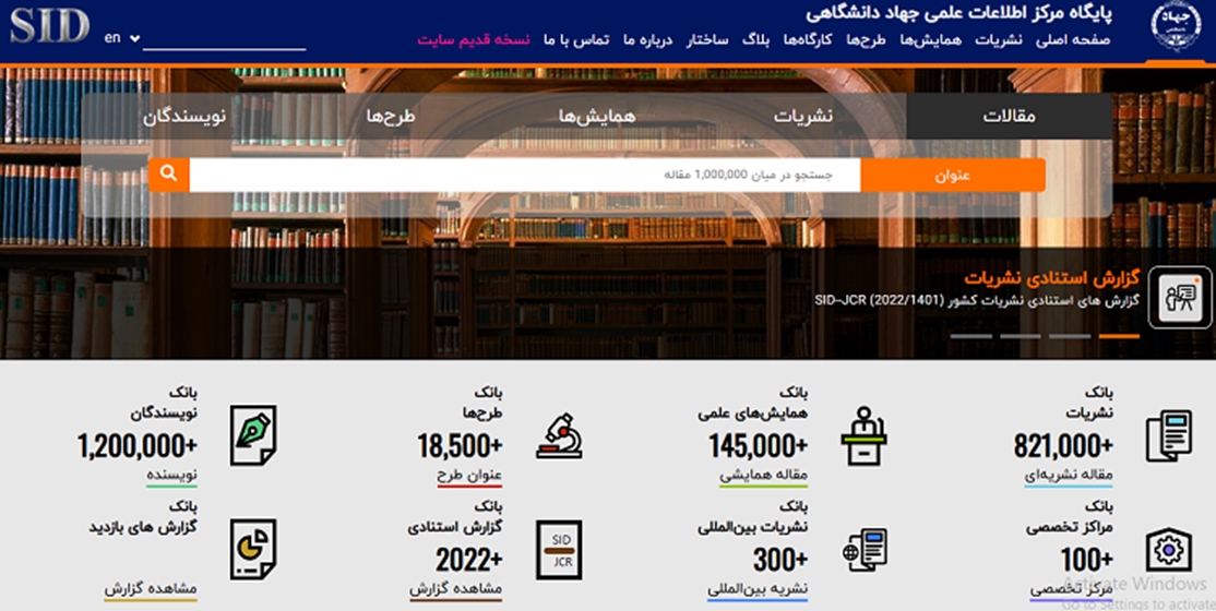 درحال حاضر بیش از ۲۳۰۰ عنوان نشریه از طریق تارنمای  SID. ir  به ‌ صورت رایگان به پژوهشگران ارائه می‌‌ شود. دسترسی به بانک همایش‌ های داخلی، طرحها، نویسندگان، گزارش استنادی نشریات و… در این سامانه امکان پذیر است.