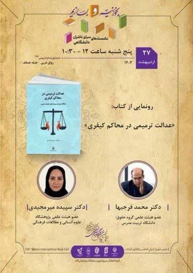 از کتاب « عدالت ترمیمی در محاکم کیفری» به قلم دکتر محمد فرجیها پنج شنبه ۲۷ اردیبهشت ۱۴۰۳ ساعت ۱۰:۳۰ در محل مصلای امام خمینی (ره) رونمایی میشود.