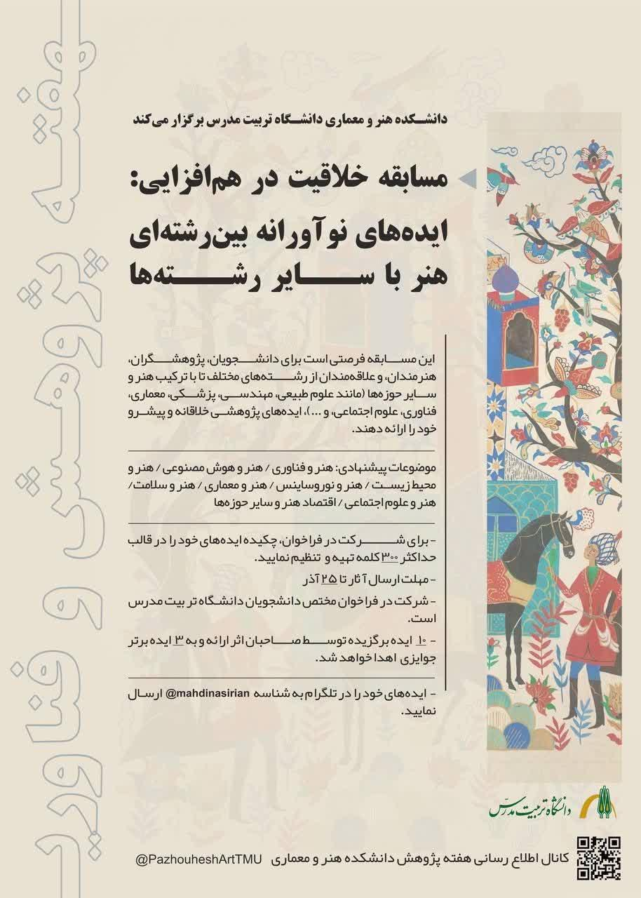 به مناسبت هفته پژوهش دانشکده هنر و معماری، مسابقه خلاقیت در هم افزایی؛ ایده های نوآورانه بین رشته ای هنر با سایر رشته ها را برگزار می کند.