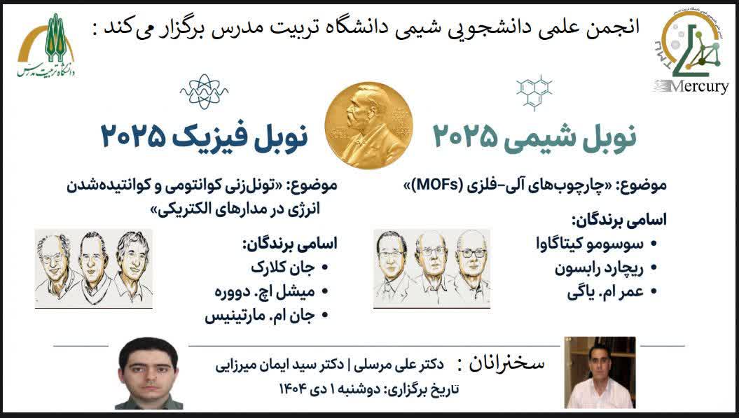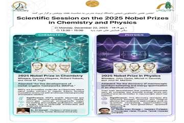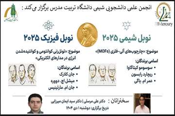 نشست تخصصی معرفی و تحلیل دستاوردهای برندگان جایزه نوبل شیمی و فیزیک ۲۰۲۵ یکم دی ماه ۱۴۰۴ در دانشکده علوم پایه برگزار می‌شود.