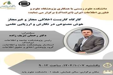 کارگاه مذکور با سخنرانی دکتر رحمان شریف زاده رئیس پژوهشکده جامعه و اطلاعات ایرانداک و  استادیار پژوهشکده جامعه و اطلاعات، گروه پژوهشی اخلاق و حقوق اطلاعات روز  یکشنبه 7 دی ماه جاری از ساعت 9 تا 12 در سالن همایش دانشکده علوم پایه برگزار می شود.