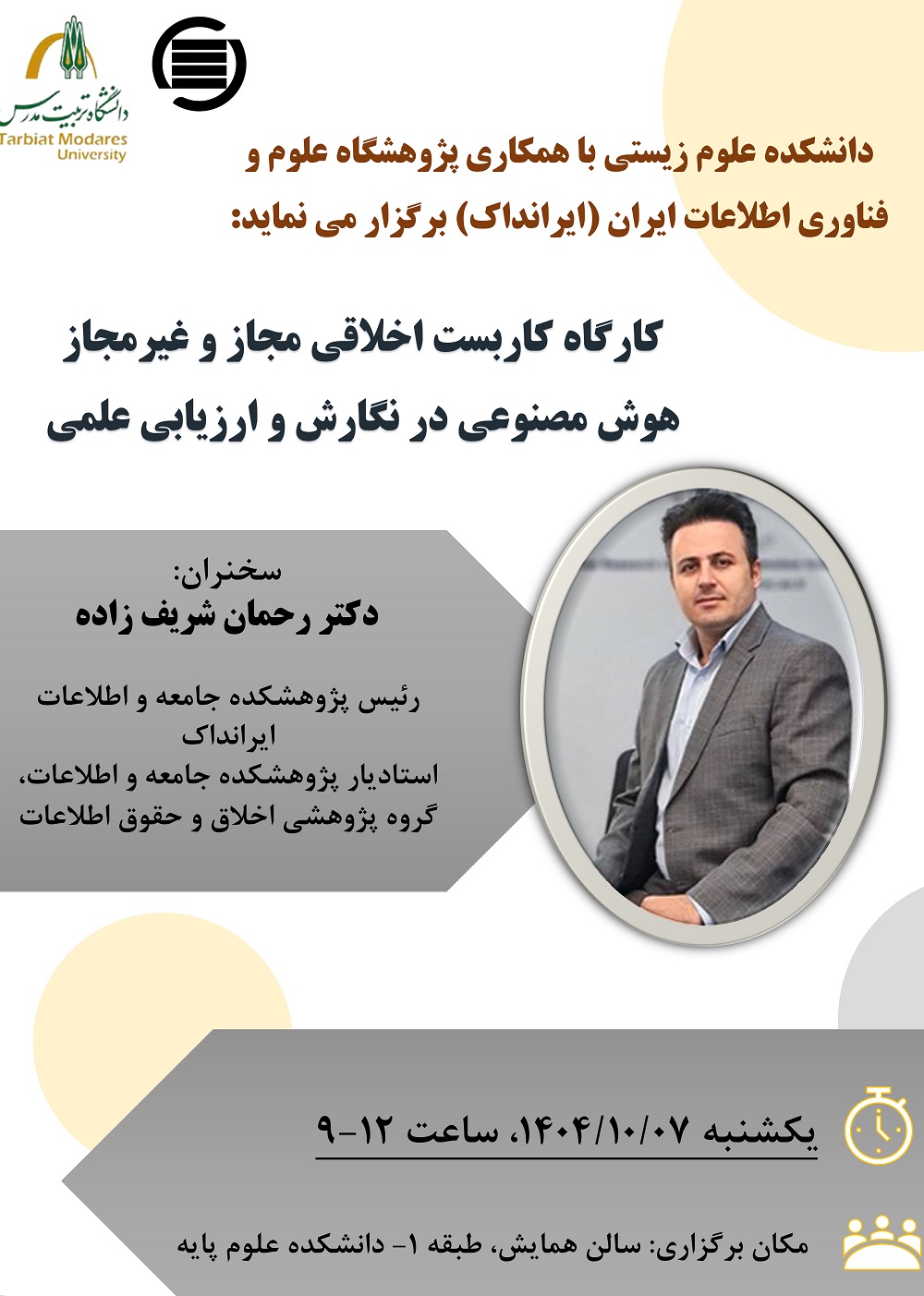 دانشکده علوم زیستی با همکاری پژوهشگاه علوم و فناوری اطلاعات ایران (ایرانداک) کارگاه «کاربست اخلاقی مجاز و غیرمجاز هوش مصنوعی در نگارش و ارزیابی علمی» را برگزار می کند.