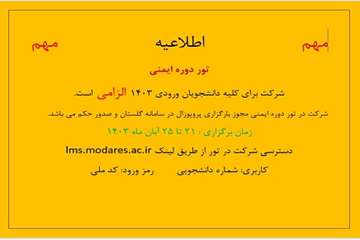 دوره آموزشی ایمنی ویژه دانشجویان ورودی ۱۴۰۳ دانشکده حقوق از ۲۱ تا ۲۵ آبان ماه ۱۴۰۳ در بستر سامانه یادگیری الکترونیکی دانشگاه (LMS) برگزار می‌شود. دانشجویان می‌بایست در یکی از روزهای مذکور به  سامانه یادگیری الکترونیکی دانشگاه مراجعه و با ثبت نام کاربری: شماره دانشجویی و گذرواژه: کد ملی در دوره فوق شرکت کنند. شرکت دانشجویان کارشناسی ارشد و دکتری ورودی ۱۴۰۳ جهت مجوز بارگذاری پروپوزال در سامانه گلستان و صدور حکم الزامی است.