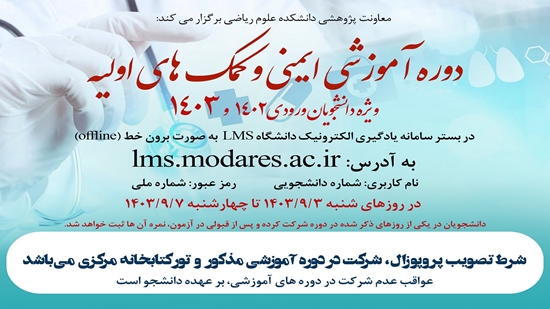 معاونت پژوهشی دانشکده علوم ریاضی دوره آموزشی ایمنی و کمکهای اولیه را برای دانشجویان ورودی ۱۴۰۲ و ۱۴۰۳ از ۳ تا ۷ آذر ماه ۱۴۰۳ در بستر سامانه یادگیری الکترونیکی دانشگاه (LMS) همه روزه بصورت برون خط (offline) برگزار میکند. دانشجویان میبایست در یکی از روزهای مذکور به سامانه یادگیری الکترونیکی دانشگاه مراجعه و با ثبت نام کاربری: شماره دانشجویی و گذرواژه: شماره ملی در دورههای فوق شرکت کنند. پس از قبولی دانشجو در آزمون، نمره دوره برای وی ثبت میشود. شرکت در این دوره الزامی است و شرط تصوب پروپوزال، شرکت در دورە آموزشی مذکور و تورکتابخانە مرکزی میباشد.