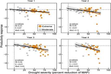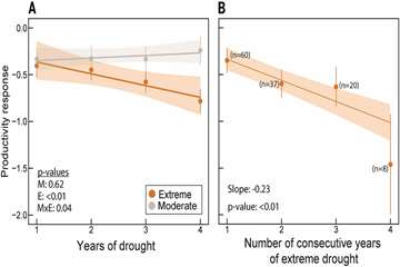 با تشدید تغییرات اقلیمی، خشکسالی‌های شدیدتر و طولانی‌تری در بسیاری از مناطق جهان رخ می‌دهند. برخی اکوسیستم‌ها در برابر خشکسالی‌های خفیف تا متوسط انعطاف‌پذیری نشان داده‌اند، اما این مقاومت ممکن است در برابر خشکسالی‌های شدید از بین برود. به‌طور میانگین، تولید اولیه در سال‌های خشکسالی متوسط حدود ۲۹ درصد کاهش یافت، اما در خشکسالی‌های چندساله این کاهش تشدید نشد. در مقابل، خشکسالی‌های شدید منجر به افت شدیدتر تولید و کاهش توان بازیابی اکوسیستم شدند، به‌ویژه در مناطق خشک‌تر و زیستگاه‌هایی با تنوع گیاهی کمتر. کاهش تولید پس از چهار سال خشکسالی شدید، نسبت به سال نخست، حدود ۲.۵ برابر بیشتر بود. این نتایج نشان‌دهنده تغییر بنیادین در رفتار اکوسیستم‌ها در مواجهه با خشکسالی‌های شدید و طولانی‌مدت است؛ از حفظ عملکرد کاهش‌یافته در طول زمان، تا افت تدریجی و عمیق‌تر تولید اولیه.