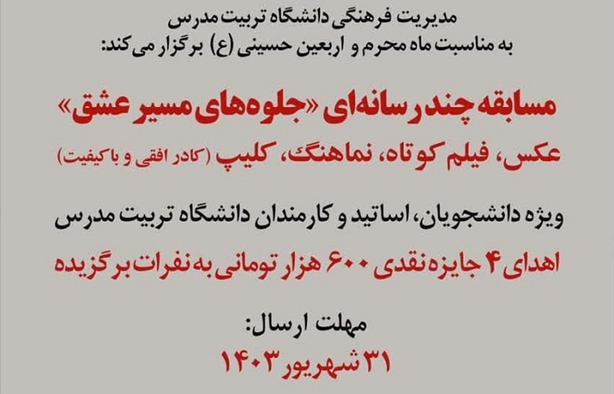 مدیریت فرهنگی دانشگاه تربیت مدرس به مناسبت ماه محرم و اربعین حسینی (ع) مسابقه چند رسانه‌ ای « جلوه‌ های مسیر عشق» (ویژه دانشجویان، اساتید و کارمندان دانشگاه تربیت مدرس) را برگزار می‌کند. بخش‌ های مسابقه شامل  عکس، فیلم کوتاه،   نماهنگ و  کلیپ می‌باشد. (آثار دریافتی که دارای کادر افقی و با کیفیت مطلوب باشند، به مرحله داوری راه خواهند یافت) محورهای مسابقه: - جلوه‌ های ویژه تاسوعا و عاشورای حسینی و مراسم معنوی پیاده‌ روی اربعین- جلوه‌ های ویژه ماه محرم و مراسم پیاده‌ روی جاماندگان اربعین- حضور دانشگاهیان تربیت مدرس در مراسم اربعین سال ۱۴۰۳- خدمات موکب‌ ها در خدمت‌ رسانی - حضور اقشار مختلف در عزاداری‌ ها و پیاده‌ روی اربعین- آئین‌ های عزاداری تاسوعا و عاشورای حسینی و مراسم اربعین در سراسر کشوربه نفرات برگزیده هر بخش مسابقه مبلغ ۶۰۰ هزار تومان جایزه نقدی اهدا می‌ شود. مهلت ارسال آثارتا ۳۱ شهریور ماه می‌باشد. شیوه ارسال آثار: بارگذاری در سامانه مسابقات فرهنگی دانشگاه تربیت مدرس به آدرس: b2n. ir/mosabeghe1403