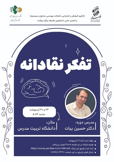انجمن علمی دانشجویی فلسفه دانشگاه تربیت مدرس با همکاری کارگروه فرهنگی و اجتماعی دانشکده صنایع و مهندسی سیستم‌ها کارگاه آموزشی «تفکر نقادانه» برگزار می‌کند.