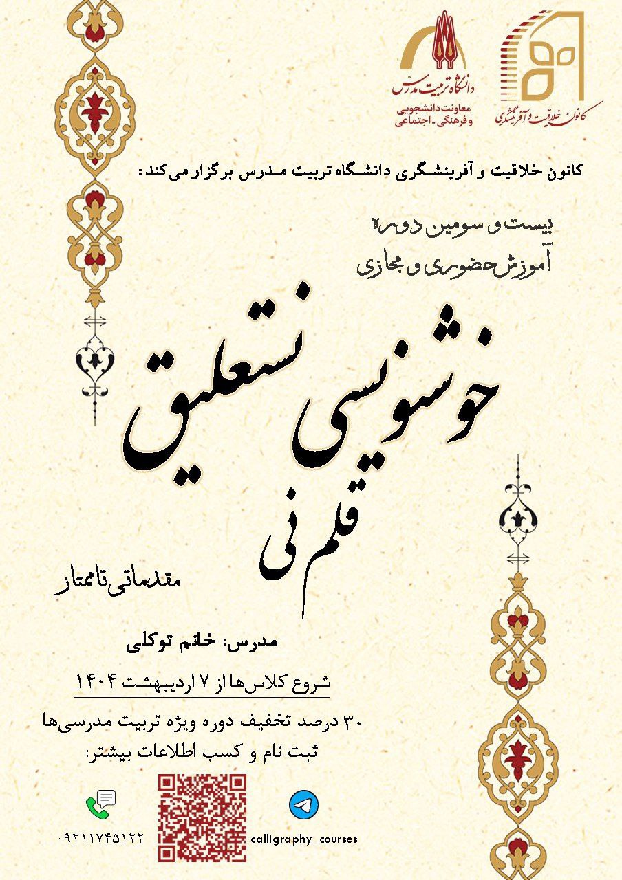 کانون فرهنگی خلاقیت و آفرینشگری دانشگاه تربیت مدرس بیست و سومین دوره آموزش حضوری و مجازی «خوشنویسی نستعلیق با قلم نی» را برگزار میکند.