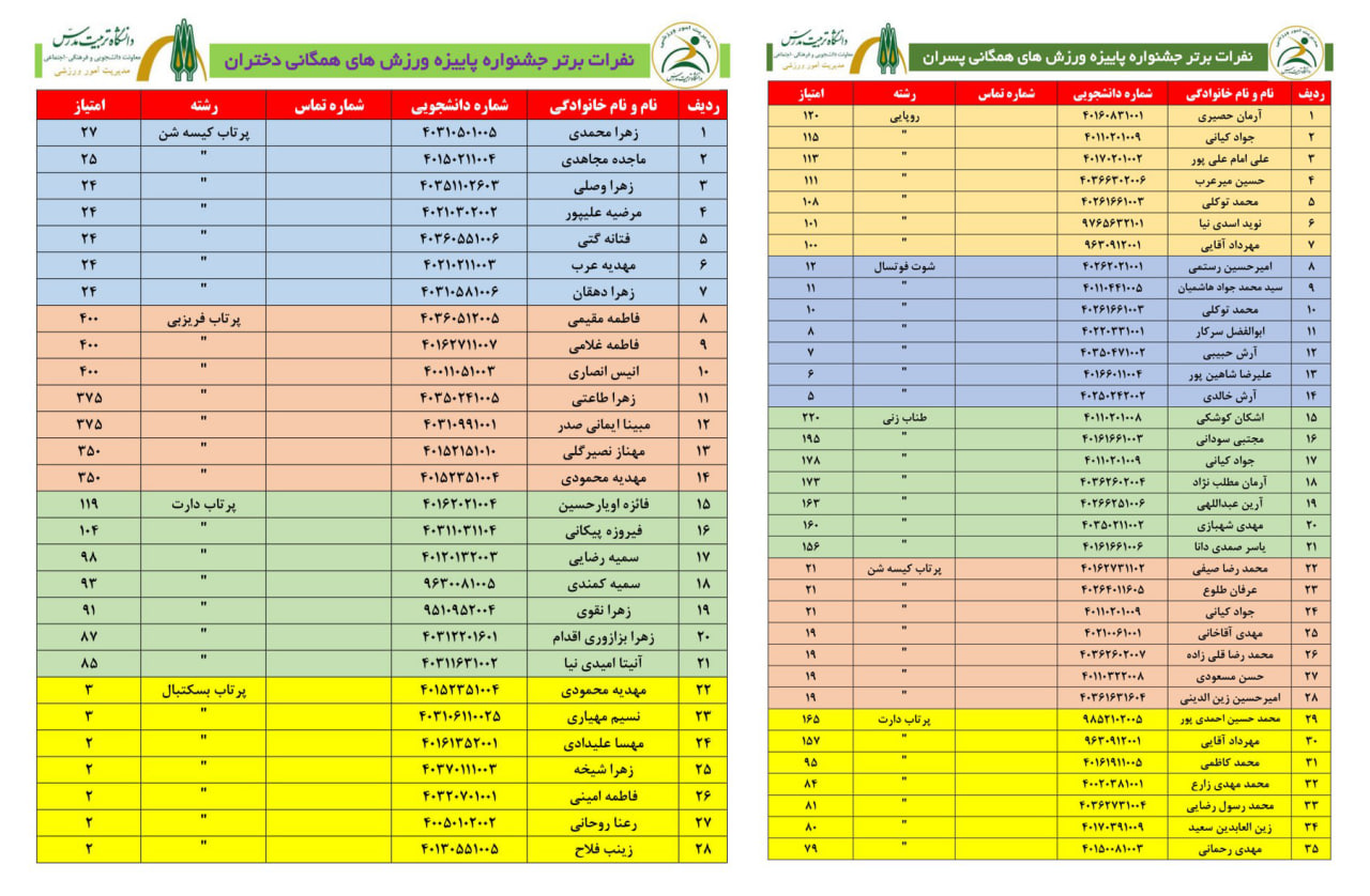 همچنین مدیریت ورزشی دانشگاه اسامی نفرات برتر جشنواره پاییزه ورزش‌ های همگانی را اعلام کرد.