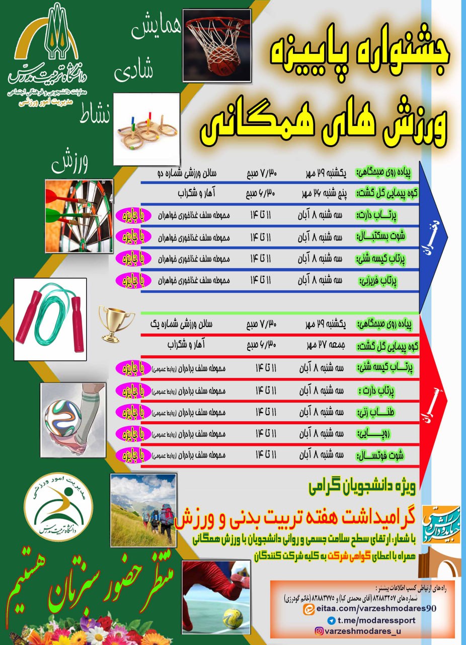 شعار این جشنواره که روز سه شنبه ۸ آبان از ساعت ۱۱ تا ۱۴ برگزار خواهد شد « ارتقای سطح سلامت جسمی و روانی دانشجویان با ورزش همگانی» می‌ باشد. به شرکت کنندگان گواهی حضور و به برترین‌ ها جایزه داده می‌ شود. محل برگزاری مسابقات بانوان: محوطه سلف غذاخوری خواهرانمحل برگزاری مسابقات آقایان: محوطه سلف غذا خوری برادران یا جنب روابط عمومی