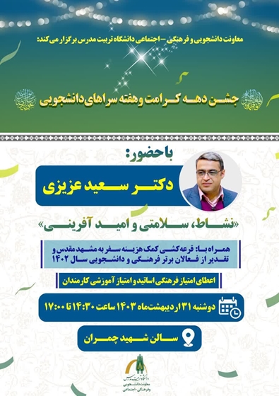 معاونت دانشجویی و فرهنگی اجتماعی دانشگاه تربیت مدرس جشن بزرگ دهه کرامت و هفته سراهای دانشجویی برگزار میکند.