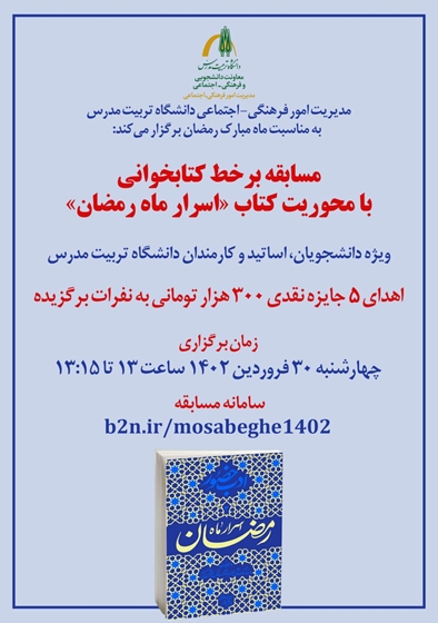 مدیریت امور فرهنگی- اجتماعی دانشگاه تربیت مدرس به مناسبت ماه مبارک رمضان مسابقه کتابخوانی با محوریت کتاب صوتی « اسرار ماه رمضان» را به صورت برخط از طریق سامانه مسابقات فرهنگی دانشگاه برگزار می‌ کند و به ۵ نفر از برگزیدگان جایزه نقدی ۳۰۰ هزار تومانی اهدا خواهد کرد.