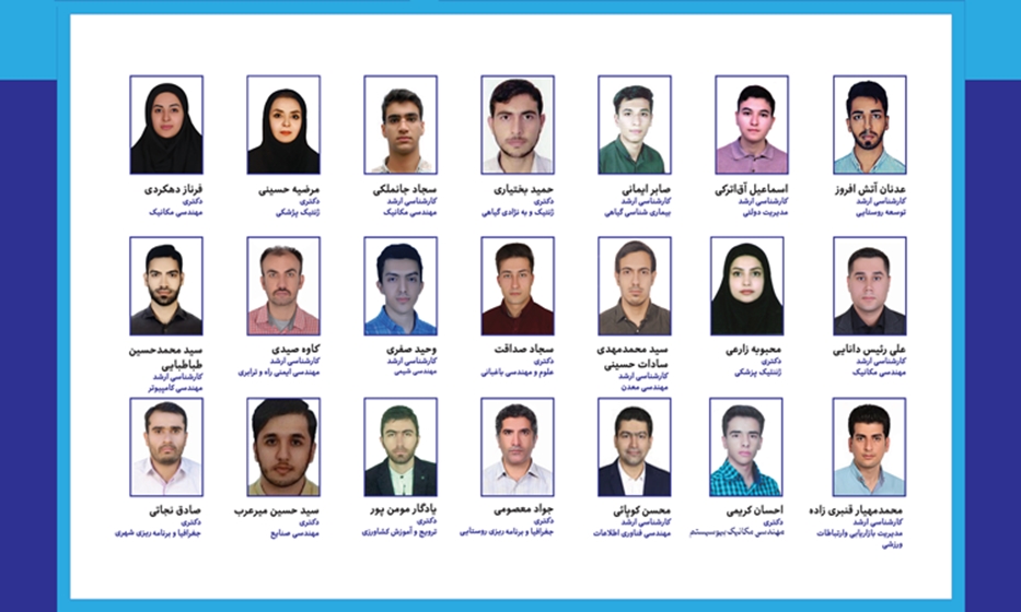 ۱)  دانشکده کشاورزی، آتش‌ افروز عدنان، ارشد، ترویج و آموزش کشاورزی، ۴۰۲۳۰۹۷۱۰۰۱ ۲)  دانشکده مدیریت و اقتصاد، آق‌ اترکی اسماعیل، ارشد، مدیریت دولتی، ۴۰۳۱۱۶۳۱۰۰۱ ۳) دانشکده کشاورزی، ایمانی‌ ‌ حسنلوئی صابر، ارشد، بیماری‌ شناسی گیاهی، ۴۰۲۳۰۲۰۱۰۰۱۴) دانشکده کشاورزی، بختیاری حمید، دکتری، ژنتیک و به‌ نژادی گیاهی، ۴۰۳۳۰۰۱۲۰۰۱۵) دانشکده مهندسی مکانیک، جانملکی سجاد، ارشد، مهندسی مکانیک طراحی کاربردی، ۴۰۳۶۵۶۳۱۰۰۳۶) دانشکده علوم پزشکی، حسینی مرضیه، دکتری، ژنتیک پزشکی، ۴۰۲۲۰۴۱۲۰۰۲۷) دانشکده مهندسی مکانیک، دهکردی فرناز، دکتری، مهندسی مکانیک، ۴۰۰۶۵۶۳۲۰۰۲۸)  دانشکده مهندسی مکانیک، رئیس‌ دانائی علی، ارشد، مهندسی مکانیک، ۴۰۳۶۵۶۲۱۶۰۶ ۹) دانشکده علوم پزشکی، زارعی محبوبه، دکتری، ژنتیک پزشکی، ۴۰۲۲۰۴۱۲۰۰۴۱۰) دانشکده مهندسی معدن و مواد، سادات‌ حسینی سیدمحمدمهدی، ارشد، مهندسی معدن، ۴۰۳۶۰۵۹۱۰۰۴۱۱)  دانشکده کشاورزی، صداقت‌ نوقابی سجاد، دکتری، علوم و مهندسی باغبانی، ۴۰۱۳۰۰۳۲۰۰۲۱۲) دانشکده مهندسی شیمی، صفری وحید، ارشد، مهندسی شیمی، ۴۰۲۶۲۲۱۱۰۰۴ ۱۳) دانشکده مهندسی عمران و محیط زیست، صیدی قلعه‌ گاه کاوه، ارشد، مهندسی ایمنی راه و ترابری، ۴۰۳۶۳۳۸۱۰۰۳۱۴) دانشکده مهندسی برق و کامپیوتر، طباطبائی سیدمحمدحسین، ارشد، مهندسی کامپیوتر نرم‌ افزار، ۴۰۳۶۱۶۳۱۰۰۵۱۵)  دانشکده علوم انسانی، قنبری‌ زاده مهیار، ارشد مدیریت ورزشی - مدیریت بازاریابی وارتباطات ورزشی، ۴۰۲۱۰۲۱۱۰۰۴ ۱۶)  دانشکده کشاورزی، کریمی یایشهری احسان، دکتری، مهندسی مکانیک بیوسیستم - طراحی ماشین‌ های کشاورزی، ۴۰۲۳۰۹۱۲۰۰۳ ۱۷) دانشکده مهندسی صنایع و سیستم‌ ها، کوپائی محسن، ارشد مهندسی فناورری اطلاعات، ۴۰۳۶۶۲۲۱۰۰۶۱۸) دانشکده علوم انسانی، معصومی جواد، دکتری جغرافیا و برنامه‌ ریزی روستایی، ۴۰۳۱۰۳۰۲۰۰۲۱۹) دانشکده کشاورزی، مومن‌ پور یادگار، دکتری ترویج و آموزش کشاورزی، ۴۰۱۳۰۰۷۲۰۰۶۲۰) دانشکده مهندسی صنایع و سیستم‌ ها، میرعرب‌ رضی سیدحسین، دکتری، مهندسی صنایع، ۴۰۳۶۶۳۰۲۰۰۶۲۱) دانشکده علوم انسانی، نجاتی صادق، دکتری، جغرافیا و برنامه‌ ریزی شهری، ۴۰۰۱۰۳۲۲۰۰۴