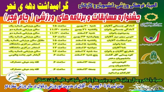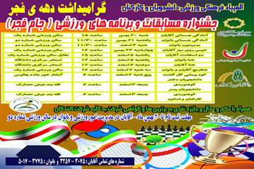 مدیریت امور ورزشی به مناسبت گرامیداشت دهه فجر، جشنواره مسابقات و برنامه‌های ورزشی (المپیاد فرهنگی ورزشی دانشجویان ، اساتید و کارمندان دانشگاه) را برگزار می کند.