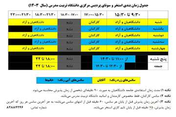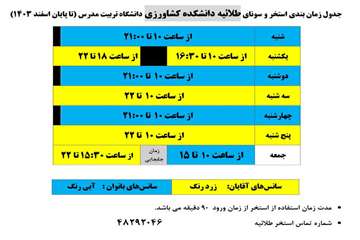 جدول زمانبندی استخر و سونای پردیس مرکزی و استخر و سونای طلائیه دانشکده کشاورزی دانشگاه تربیت مدرس در شش ماهه دوم ۱۴۰۳